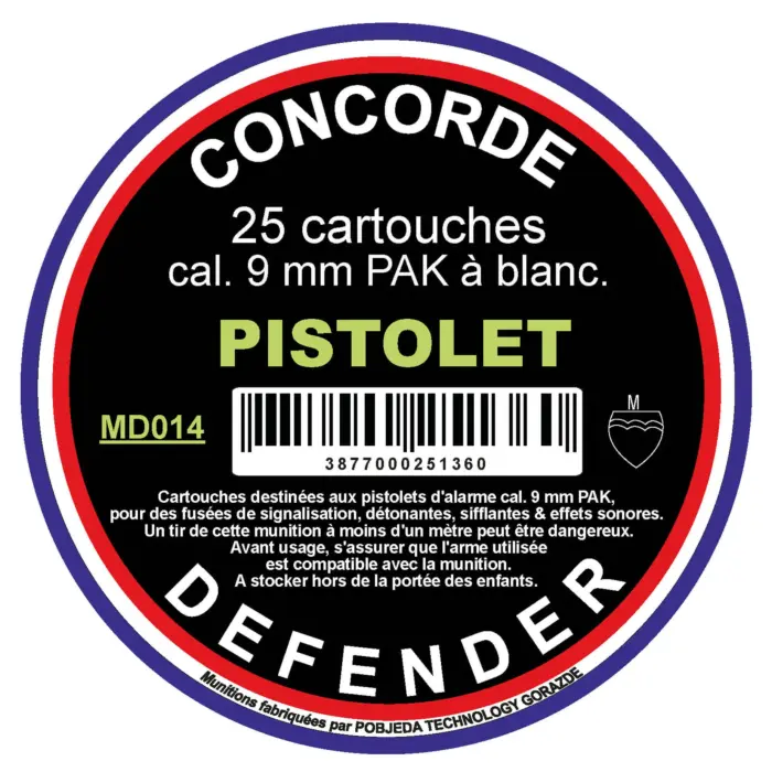 Cette boîte est composée de 25 cartouches à blanc Concorde Defender 9mm PAK pour pistolet d'alarme et de défense.