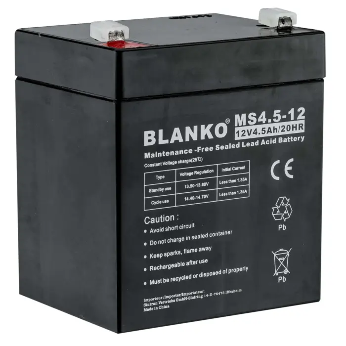 Cette batterie rechargeable 12 volts MS4,5-12 4,5 Ah mesure 90 mm (longueur) x 70 mm (largeur/profondeur) x 105 mm (hauteur) et pèse 1460 grammes.