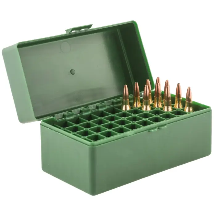 Cette boîte de rangement Megaline pour calibre 243 Win en plastique est conçue pour le stockage de 50 balles ou le transport de munitions.