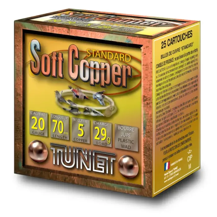 En résumé, les Tunet Soft Copper Standard Calibre 20/70 sont des munitions polyvalentes, efficaces et écologiques pour la chasse au petit gibier, combinant les avantages du calibre 20 avec ceux de la grenaille de cuivre doux.