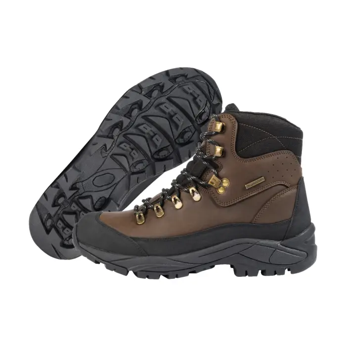 Chaussure en cuir de vache enduit et collier textile, complètement étanche grâce à une membrane imper-respirante à coutures soudées.
