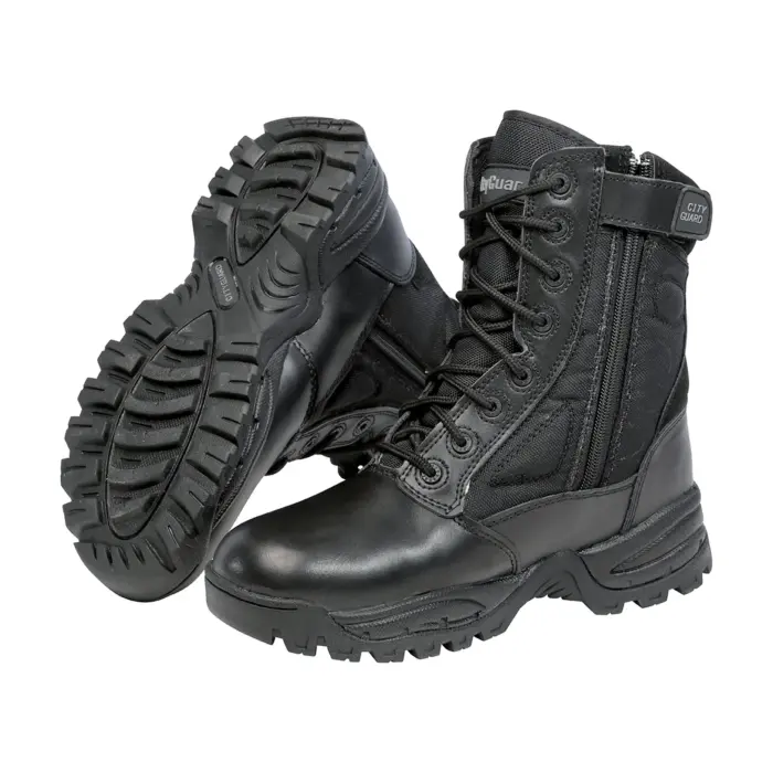 Ces rangers Mégatech double zip noires sont composées d'une tige en Oxford polyester 1000 deniers, de nubuck, de cuir et d'une semelle double densité en caoutchouc.