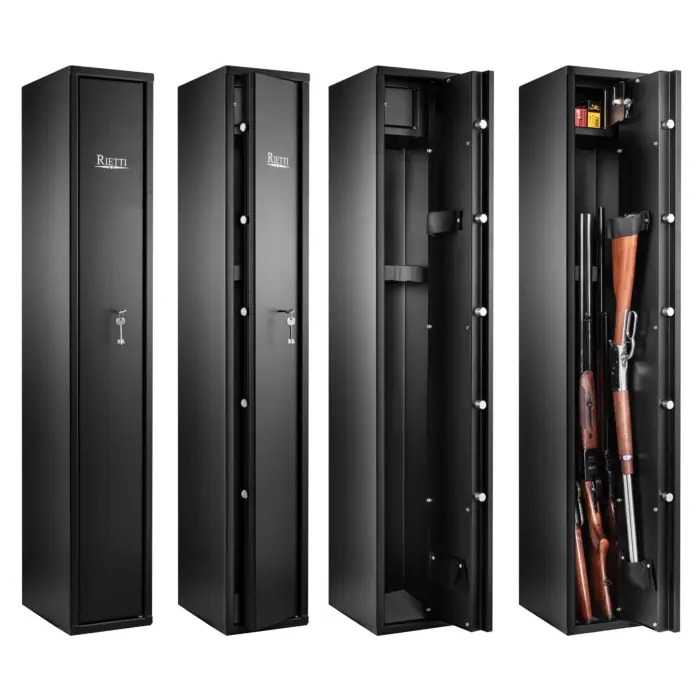 Le coffre fort Rietti 5 armes à clé de 150 cm est un modèle réputé de la marque Rietti, connu pour ses solutions de rangement d'armes à la fois esthétiques et robustes. Compact et sécurisé, il est idéal pour protéger vos armes longues et objets de valeur.