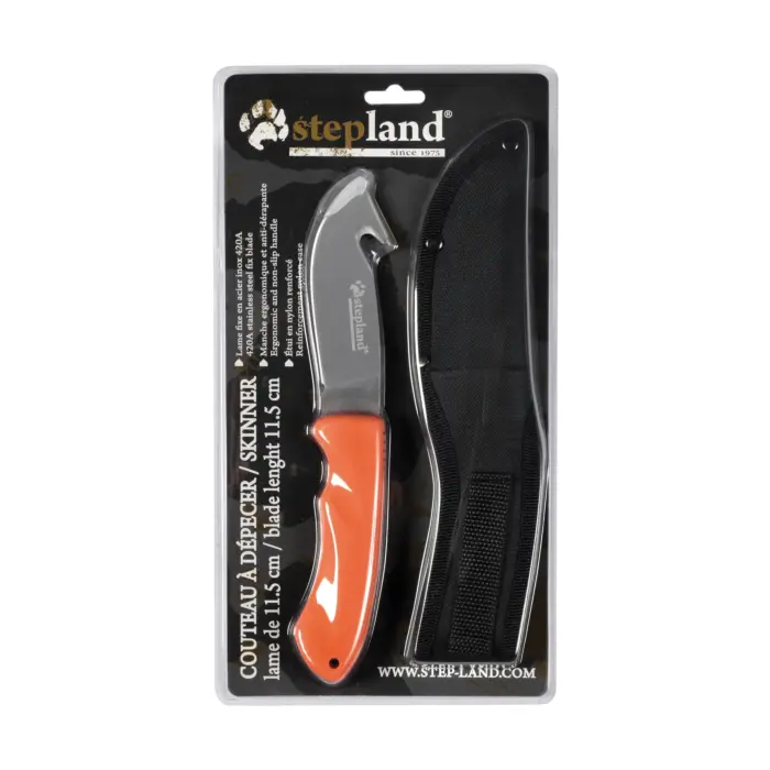 Le couteau Stepland à dépecer avec sa lame fixe inoxydable en acier 420A de 11,5 cm est équipé d'un manche gomme orange.