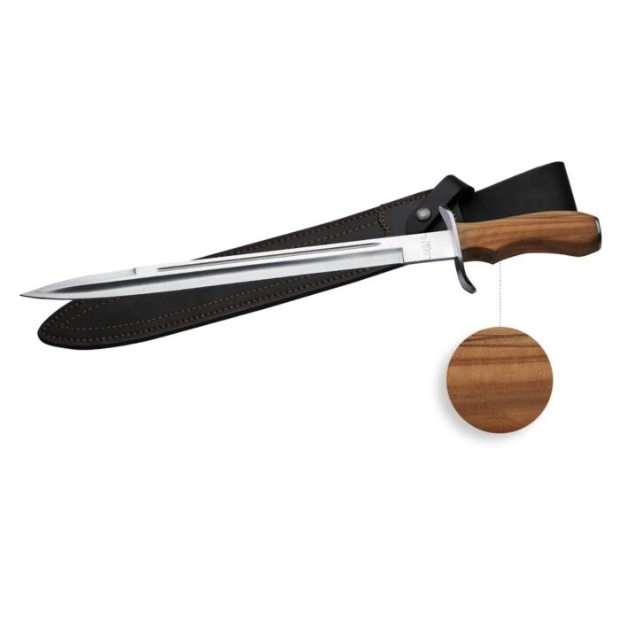 La dague de chasse Januel est un outil de caractère, alliant tradition coutelière et efficacité redoutable. Équipée d'une impressionnante lame de 33 cm en acier inoxydable, elle est spécialement conçue pour le service du gibier. Son manche en bois d'olivier véritable offre un veinage unique à chaque exemplaire, apportant une touche de noblesse naturelle et une prise en main chaleureuse. Équilibrée et puissante, cette dague est dotée d'une garde de protection généreuse pour assurer la sécurité de la main lors de l'utilisation. Un compagnon de route indispensable pour les équipages de grande vénerie et les chasseurs de grand gibier.