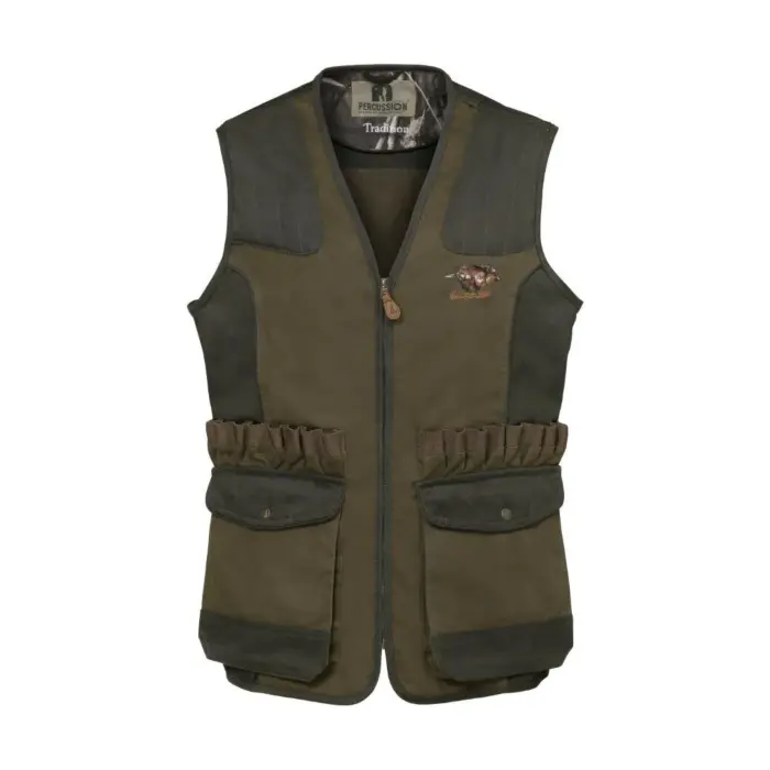 Ce gilet de chasse Tradition Percussion kaki, brodé sanglier est composé à 65 % de polyester et à 35 % de coton et il est traité DWR.