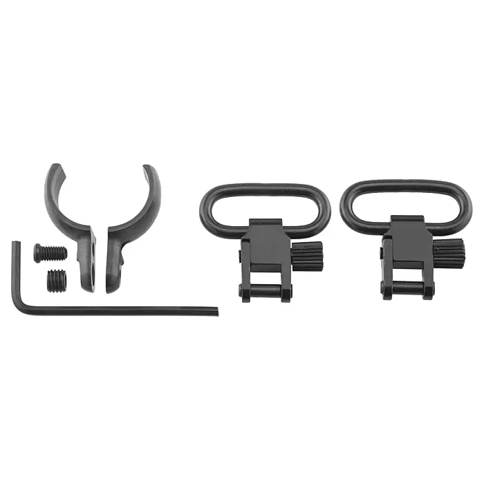 Kit Complet : Contrairement aux modèles à attache rapide seuls (qui nécessitent que les anneaux de grenadières soient déjà présents sur l'arme), ce kit est dit "complet". Cela implique qu'il contient probablement les pièces nécessaires pour installer les anneaux eux-mêmes sur le canon/tube de magasin et sur la crosse du fusil de calibre 12.