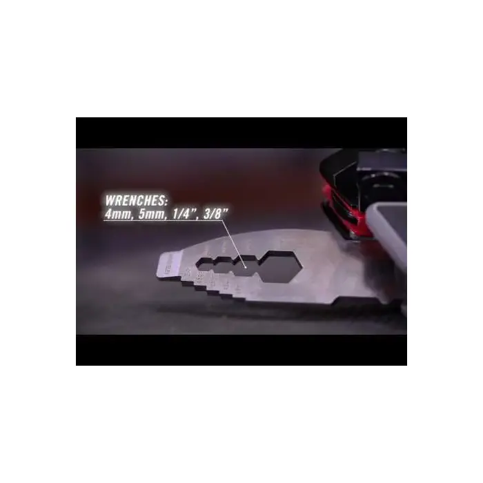 Il est équipé d'une pince à bec effilé en carbure de tungstène, d'une clef universelle, de 12 outils adaptables, d'un tournevis, d'une lame en acier inoxydable et d'une clef à chokes du calibre 410 au calibre 10, .