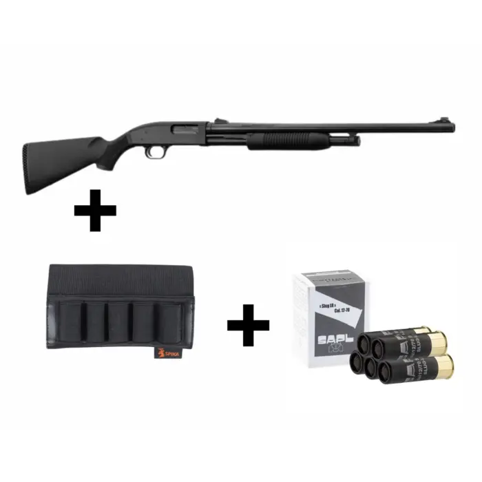Ce pack de défense comprend un fusil à pompe Mossberg Maverick 88 calibre 12 magnum, accompagné d'accessoires de défense personnelle.