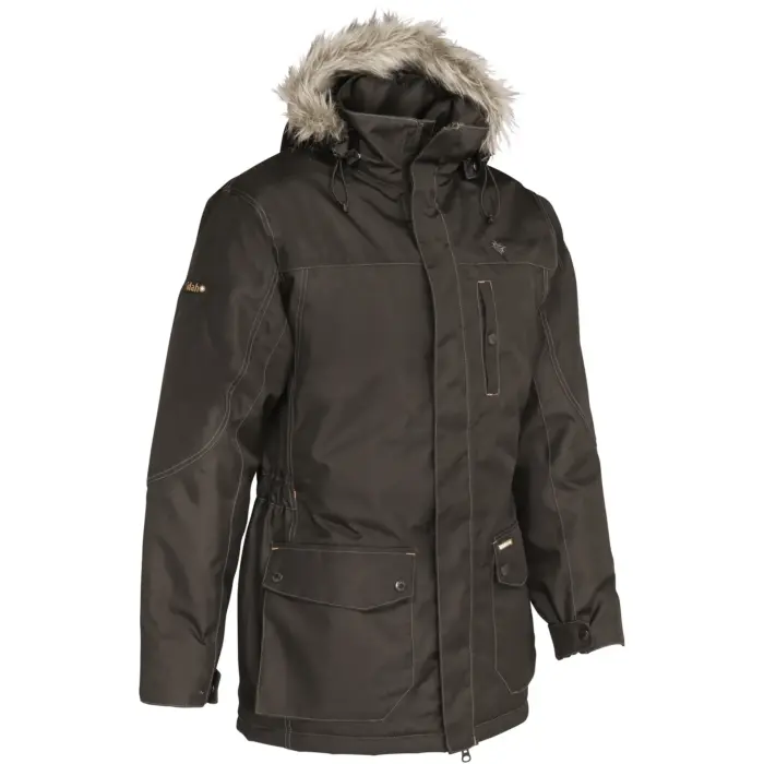 Cette parka est pourvue d'une poche poitrine, de deux poches repose-mains, de deux poches basses, d'une capuche et d'une fourrure synthétique amovible, de quatre poches intérieures dont une poche pour téléphone portable, de poignets ajustables, d'une fermeture zippée sous sa patte-pressionnée.