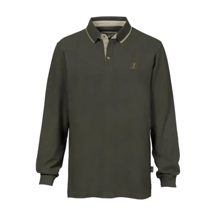 Ce polo de chasse à manches longues Percussion composé à 100 % de coton piqué 280 grammes au m² est de couleur kaki.