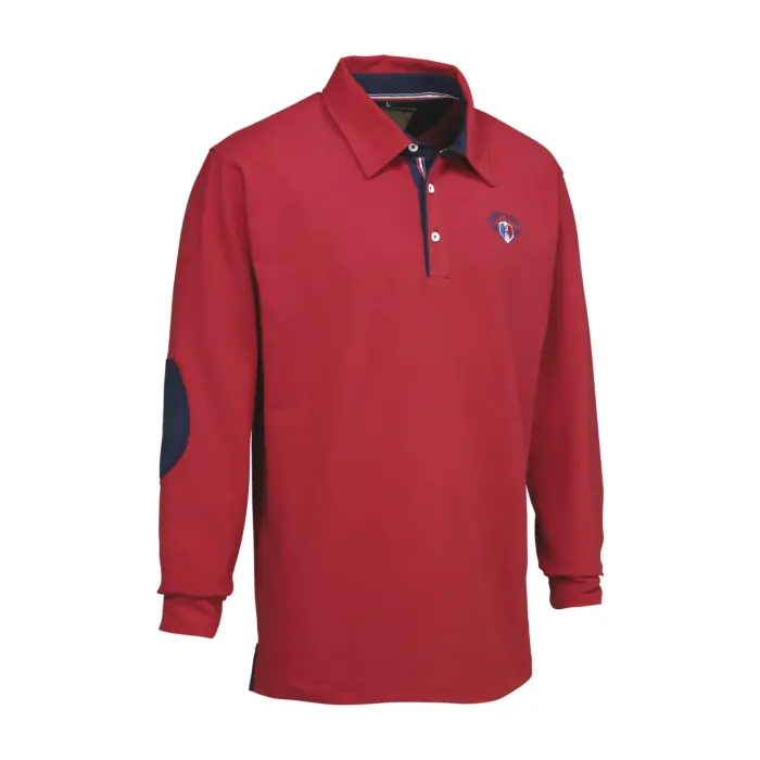 Ce polo Week-End Casual Ligne Verney Carron rouge est brodé avec un écusson bleu, blanc, rouge sur sa poitrine.
