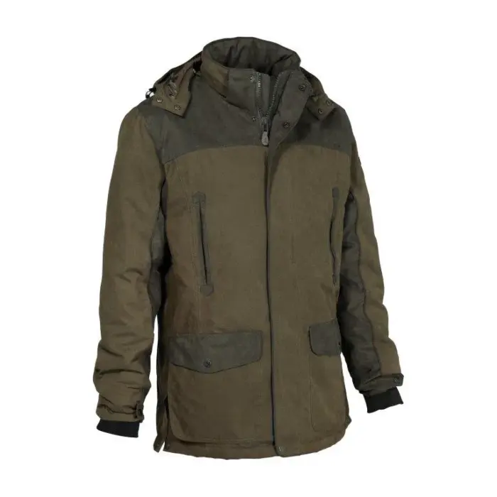 Elle est équipée également d'empiècements et de détails en suédine 100 % polyester, d'une doublure matelassée 100 % polyester, de zips d'aération sous les bras, d'une poche Napoléon, de poches repose-mains, de deux grandes poches basses avec deux rangées de cartouchières intégrées (balle et plomb calibre 12) et de pattes de maintien d'ouverture.